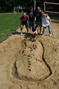 Als diese erste Hürde nun genommen war, ging es für die Gruppen dann erst einmal auf’s Rad, nach einer kurzen ersten Etappe wartete am Beachvolleyballplatz des TuS Aschen-Strang im Heidland dann aber auch schon die nächste Station. Dort mussten die Gruppen in einer Zeit von acht Minuten eine möglichst schöne Sandburg bauen. Jannis, der die Station leitete, hatte als Hilfen einige Schaufeln und Harken und einen Wassereimer gelassen, der Rest war den Gruppen selbst überlassen. Sand war auf einem unbenutzten Beachvolleyballfeld natürlich in Massen vorhanden und so brachten alle Gruppen erstaunliche Kunstwerke zustande. Den größten Einsatz zeigte in diesem Fall wohl die fünfte Gruppe, die Jan-Hendrik in den Sand eingruben und die Burg auf seinem Bauch errichteten.