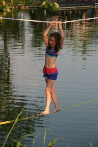 Nach meistens an die hundert Würfe ging es dann weiter durch Bockhorst und Westbarthausen zum See am Telgtenkamp, wo Jannis mit der letzten Station wartete. An dieser Stelle auch noch einmal ein riesgies Dankeschön an Volker Hörning, der noch Stunden gewartet hat, bis die erste Gruppe ankam und uns natürlich den See erst einmal zur Verfügung gestellt hat. Die Aufgabe bei dieser Station war eine über den See gespannte Slackline möglichst schnell zu überqueren. Auch wenn es ein Halteseil gab, war dies nicht immer einfach, sodass der ein oder andere eine Abkühlung in Kauf nehmen musste. Die war jedoch nicht unbedingt unwillkommen, bei der Hitze hätten einige die Station wahrscheinlich gerne schon früher gesehen. Besonders hevor stach bei dieser Station Jan Brinkkötter, einem Seiltänzer gleich überquerte er den See deutlich schneller als der Nächstbeste.