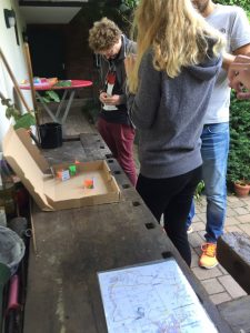 Von Hesseln ging es dann parallel zur Bundesstraße zurück in Richtung Dissen, der nächste Halt war in Berghausen in Heinrichs Garten. Dort mussten die Gruppen in 10 min möglichst viel Wasser durch einen Parcours bringen, doch dies