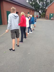 Aus Hilter ging es dann weiter, durch Remsede und dann weiter über den Glaner Weg. Hier wartete Helmut an einem Feldweg mit Spiel 3, nun war Teamgeist und Zusammenarbeit gefragt. Die Gruppen mussten einen Tischtennisball durch Sanitärrohrstücke leiten und dabei innerhalb von 5 Minuten möglichst viel Strecke zurück legen. Dies natürlich ohne den Ball fallen zu lassen, dafür gab es Abzüge. Mit einer Weite von 31,1 Metern und nur zwei fallen gelassenen Bällen sicherte sich die spätere Siegergruppe 2 auch in diesem Spiel den Sieg. Durch den zweiten Platz an dieser Station schob sich auch die letzte Gruppe, bestehen aus Moni, Marlies und Marianne, Birgit und Sönke, immer weiter nach vorne.