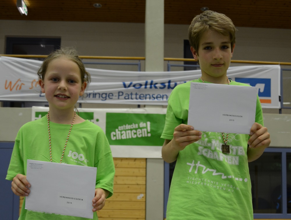Durch eine weitere hervorragende Leistung im Finale gegen die Lüneburgerin Jill Bannach gewann Lina Hasenpatt ihre Konkurrenz und durfte sich völlig verdient als Mini-Landesmeisterin 2015 feiern lassen. Doch damit war der Erfolgszug noch nicht gestoppt – nun kam es sowohl in der Jungen- als auch in der Mädchenkonkurrenz noch zu den Duellen der jeweiligen Sieger, um so einen Teilnehmer der Jungen und einen der Mädchen für das Bundesfinale zu ermitteln. Völlig unbeeindruckt von der älteren Gegnerin zeigte Lina einmal mehr tolles Tischtennis. Mit 3:1 setzte sie sich im „Superfinale“ durch und darf nun vom 12.06.-14.06. zum Bundesfinale der Mini-Meisterschaften nach Delmenhorst fahren.