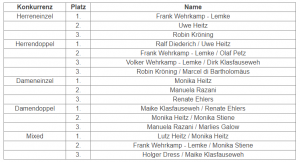 Das hochklassige und zeitweise dramatische Herrenendspiel entschied die Nr. 1 der ersten Mannschaft, Frank Wehrkamp – Lemke nur knapp im 3. Satz mit 23:21, vor dem anderen Spitzenspieler der 1. Mannschaft, Uwe Heitz! Vorjahressieger Robin Kröning konnte sich den 3. Platz vor Dirk Klasfauseweh sichern! Bei den Damen siegte die mit der meisten Erfahrung, Monika Heitz, vor Manuela Razani. Überraschend gute Leistungen erbrachte auch Renate Ehlers und erkämpfte sich verdient den 3. Platz und den Titel im Doppel! Anschließend gesellte man sich im Krebshof, um die Meister hoch leben zu lassen.