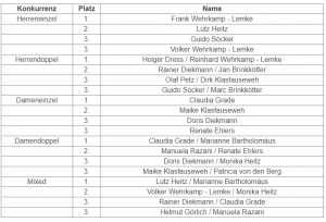 Bei den Damen setzte sich Claudia Grade, trotz einer leichten Verletzung in der sehr schweren 5er Gruppe als Gruppensiegerin durch, um danach auch Halbfinale und Finale klar zu gewinnen. Diese bestechend gute Form hielt Sie als Doppelsiegerin mit Partnerin Marianne Bartholomäus, sowie auch als Dritte im Mixed – Doppel mit Partner Rainer Diekmann. Marianne Bartholomäus erwies sich ebenso als sehr gute Mixedpartnerin mit Lutz Heitz. Beim Herrendoppel gab es einen Überraschungssieg von Reinhard Wehrkamp – Lemke und Holger Dress. Reinhard spielte nach knapp einem halben Jahr wieder Tischtennis und fand sofort wieder eine gute Form! Anschließend gesellten sich alle im Vereinslokal „Zum Krümpel“, um die Meister hoch leben zu lassen.