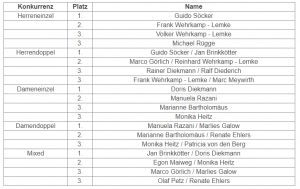 Die Einzeltitel gingen recht unerwartet, an zwei die sonst mehr im Schatten der wahren Spitzenspieler stehen. Guido Söcker bezwang im Finale Frank Wehrkamp – Lemke recht deutlich mit 3:0 Sätze. Bei den Damen siegte Doris Diekmann