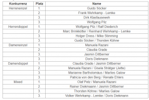 Guido Söcker und Frank Wehrkamp – Lemke, wie bereits die letzten drei Jahre, konnte sich zwar nur im fünften Satz, aber doch recht souverän, Guido für sich entscheiden. Im Herrendoppel triumphierten die „ältere“ Garde Wolfgang Pilz