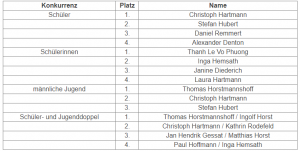Bei den Schülerinnen konnten krankheitsbedingt Kathrin und Maren Hemesath nicht ins Spielgeschehen eingreifen. Somit gewann unsere Spitzenspielerin Thanh Le Vo Phuong überragend die Konkurrenz vor Inga Hemsath.