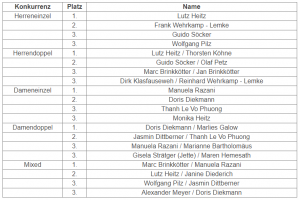 einen hervorragenden 3. Platz. Im Mixed mit Volker Wehrkamp-Lemke errang Thanh einen guten 5. Platz. Im Mixed spielte Janine Diederich, 13 Jahre alt, sich mit Lutz Heitz bis ins Finale, um sich auch dort nur im 5.Satz nach Verlängerung